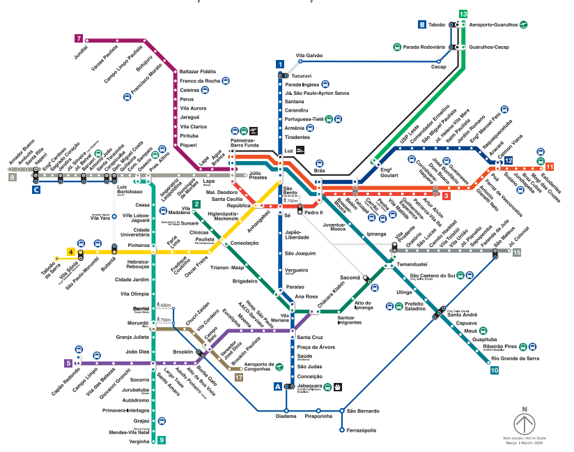 O Governo de São Paulo disponibilizou o mapa atualizado do metrô e dos trens do transporte metropolitano de São Paulo com a inauguração da Linha 17-Ouro do Metrô.